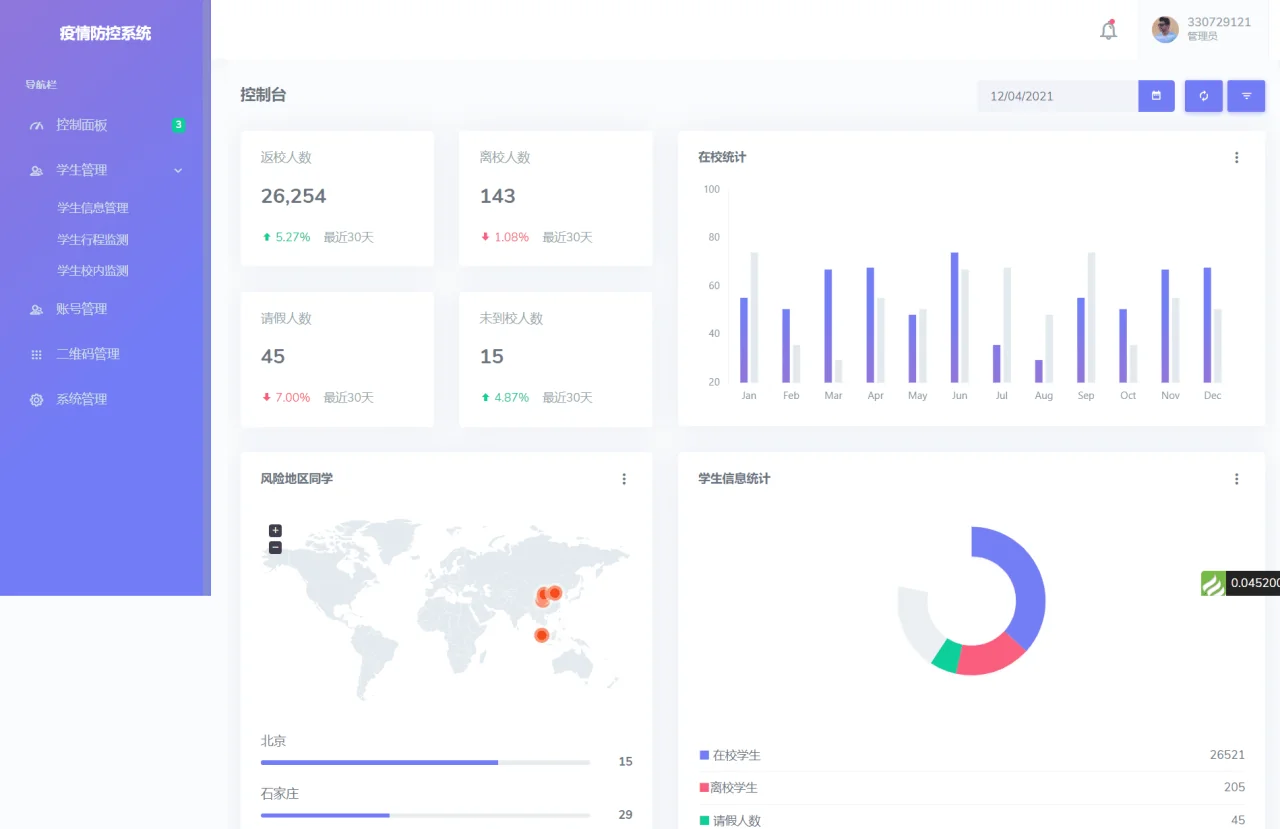 功能包括老师和学生角色权限,大数据图表展示,扫码进出校园,校园行程记录,生成二维码,学生管理,网站管理,学生签到打卡等功能等等。
