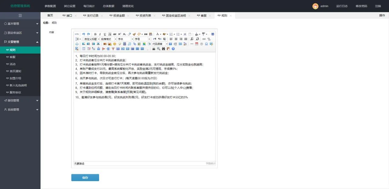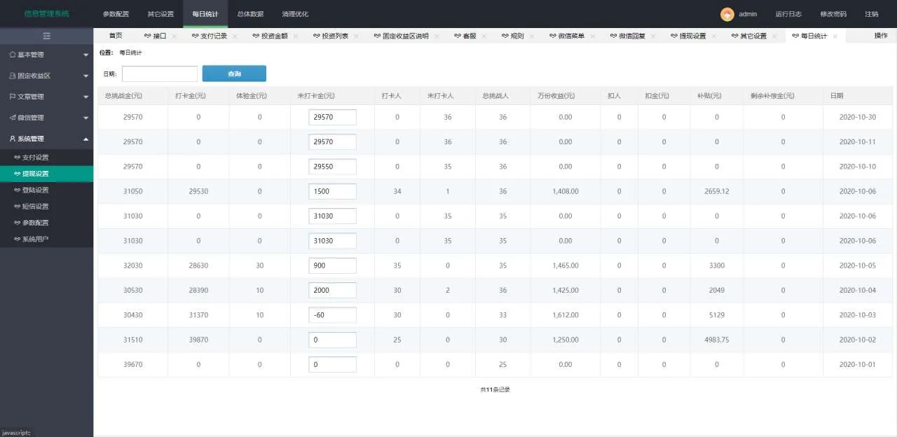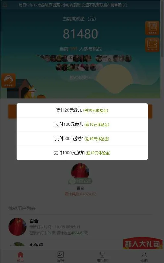 A880 【打卡定制版】最新H5定制版早起打卡支付已接带完整搭建教程 admin 编辑 商品价格 VIP免费下载 联系客服 立即下载 虚拟商品,自动发货 7 天无忧退款 单独定制的版本,并未流通过,UI很漂亮,专业的早起打开平台,和之前的那个打卡套理财的, 不是一个版本,运营逻辑也完全不同。支付已经接好派特了,简单替换下秘钥就可以了。 带完整搭建教程,萌新都可以自己搭建了。前端界面实测截图 后端界面实测截图
