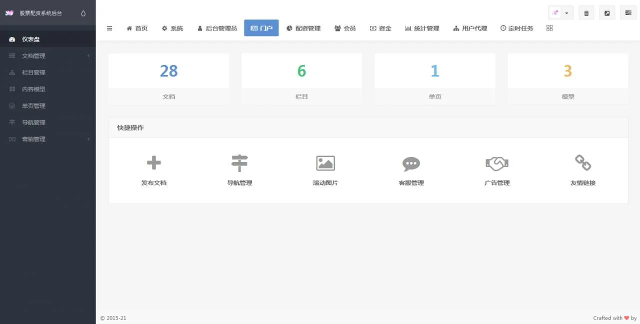 C096 PHP源码_配资系统源码,策略买点,策略A股系统,完美运行 admin 编辑 商品价格 VIP免费下载 联系客服 立即下载 虚拟商品,自动发货 7 天无忧退款 安装说明:演示环境linux+宝塔 NX1.18 php5.6+mysql5.6 运行目录:public 伪静态选择thinkPHP 数据库配资文件applicationdatabase.php 搭建好删除缓存文件 后台 /admin 用户:admin 密码:www.qilinyuanma.com麒麟源码网亲测前台WAP截图 麒麟源码网亲测前台PC截图 麒麟源码网亲测后台截图