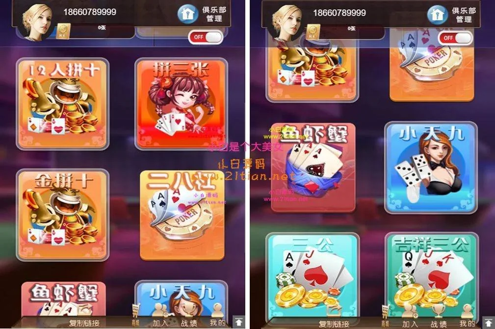内包含12人牛牛、9人牛牛、6人牛牛、12人三张、6人三张、斗地主、十三水、广东麻将、双扣,二八杠,牌九,三公,德州扑克,鱼虾蟹,扎金花等等