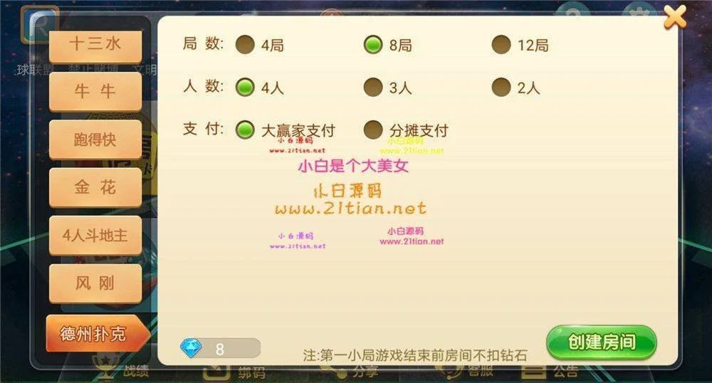 量推4代星球大联盟房卡QP全新升级版 全新UI+完整全套程序组件 admin 编辑 商品价格 VIP免费下载 联系客服 立即下载 虚拟商品,自动发货 7 天无忧退款 量推4代游戏界面与之前版别比较彻底不同,是量推全新升级版别,无论游戏画面、UI设计风格都不相同,但程序组件内核根本差不多的,量推4代支持牌友圈、联盟沙龙,渠道BC源I 9 f j h码别离有多种游戏,包含福州麻将、十三水、牛牛、跑得快、金花、4人斗地主、风刚、德州扑克等游戏,完好全套程序组件,建立方法可以参考之前的版别视频教程就可以了。