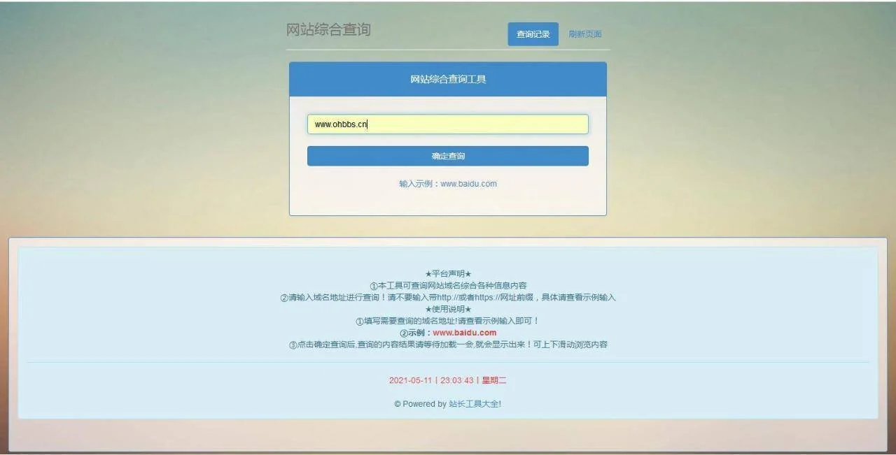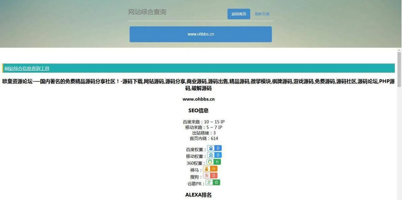 P20 网站站长综合seo查询工具源码 admin 编辑 商品价格 VIP免费下载 联系客服 立即下载 虚拟商品,自动发货 7 天无忧退款 网站综合网查询工具源码站长seo综合查询工具提供网站收录查询和站长查询以及百度权重值查询等多个站长工具, 免费查询各种数据,包括收录量、反链、域名Whois查询、ping查询、子域名查询、服务器IP查询及关键词排名等 查询结果后会自动更新保存数据记录,更容易方便网站域名收录爬取 支持上传二级目录访问!源码截图: