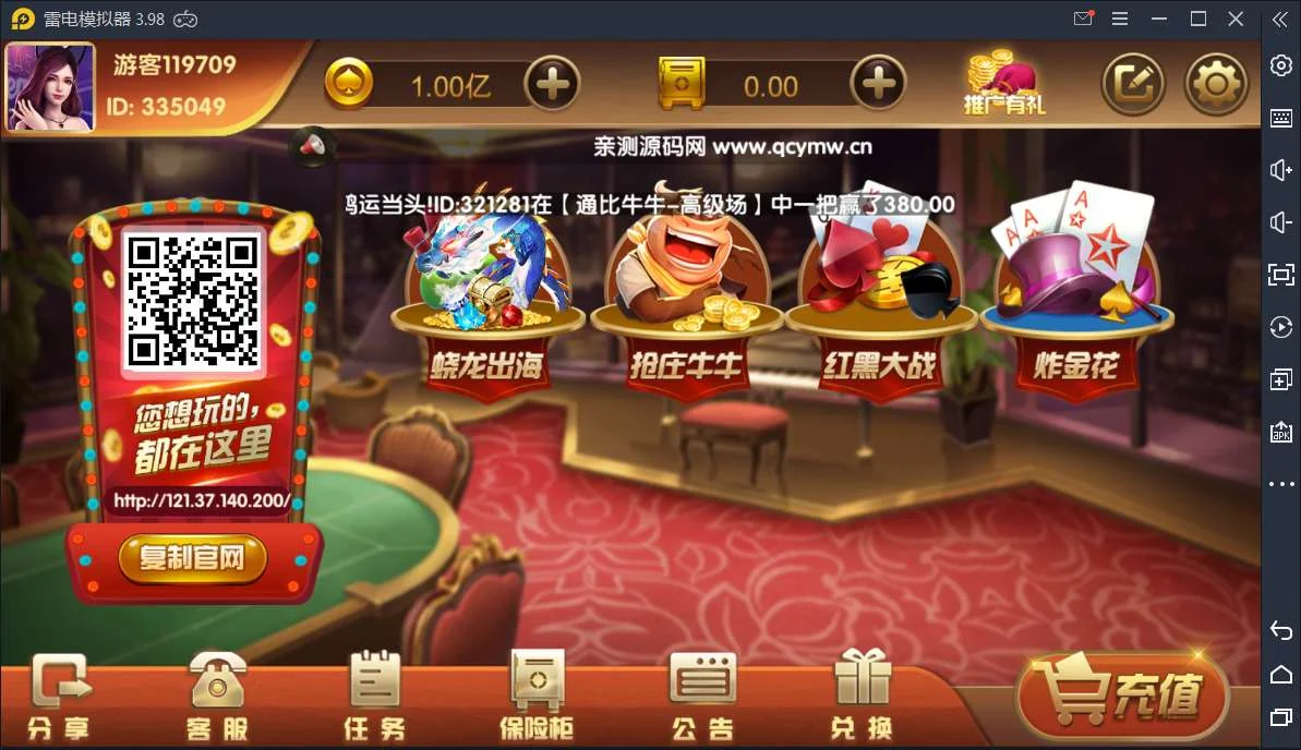 全新红色永利版本功能比较完整,附带后台、前端管理,全民代理推广系统、内含多款游戏,分别为百人牌九、通比牛牛、抢庄牛牛、二八杠、蛟龙出海、李逵捕鱼、百人牛牛、斗地主、龙凤斗、百家乐、炸金花、红黑大战、水果拉霸、ssc,关于控制功能十分完美,QP游戏可以提现的, Z 8 P 1 ` n d支持后台点控、库存、前台超端控制。