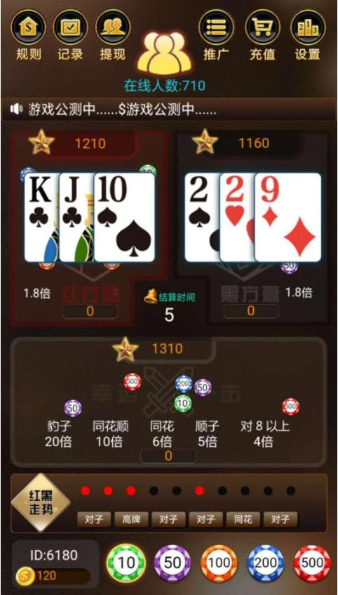 H5红黑大战 扎金花 最新无授权游戏源码 6级返佣 admin 编辑 商品价格 VIP免费下载 联系客服 立即下载 虚拟商品,自动发货 7 天无忧退款 源码描述:H5红黑大战 扎金花 最新无授权游戏源码 6级返佣+支付接口除了比大小,更有特殊牌型下注区域,增加了游戏趣味性首页即带玩法规则介绍,顶免费游戏源码网部实时显示在线人数,滚动公告前台带记录功能,可查看金币消耗和往期游戏下注和开奖情况每个玩家带有自己专属推广二维码,发展下级,支持六免费游戏源码级带工资功能源码截图: