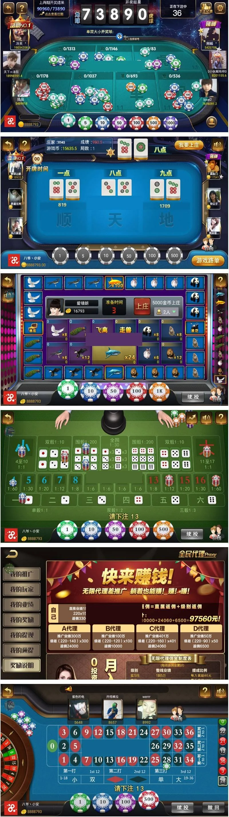 内置游戏:龙凤斗 红黑大战 百家乐 百人牛牛和二八杠 捕鱼 斗地主 扎QP游戏金花 枪庄牛牛 飞禽走兽 轮盘 百人骰宝