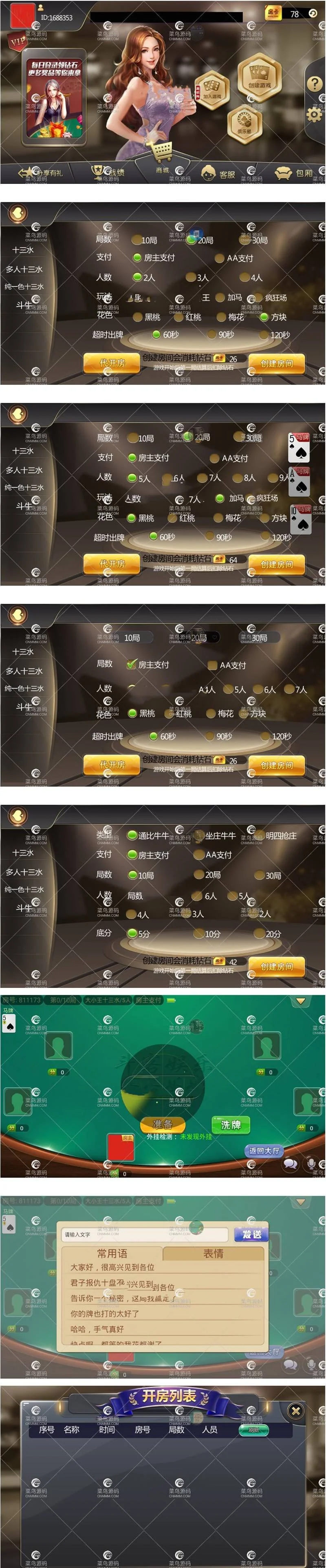 最新斗客浙友十三水+带俱乐部+积分模式+完美运营组件+带胜率控制 admin 编辑 商品价格 VIP免费下载 联系客服 立即下载 虚拟商品,自动发货 7 天无忧退款 源码描述:这个主打就是十三水,然后带有牛牛,俱乐部模式,还有积分上下分模式,十三水带有买马模式,算是比较齐全的一个东西。源码截图: