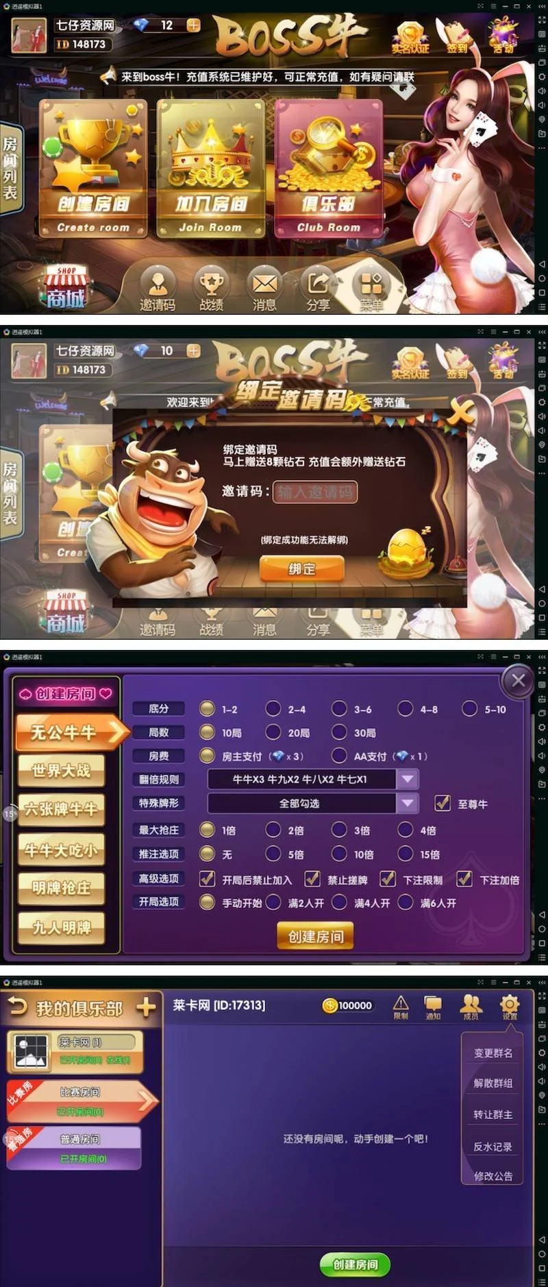 2019最新BOSS房卡牛牛全套:含Android+iOS,带俱乐部功能,支持积分模式+抽水模式 admin 编辑 商品价格 VIP免费下载 联系客服 立即下载 虚拟商品,自动发货 7 天无忧退款 源码描述:2019最新BOSS房卡牛牛全套:含Android+iOS,带俱乐部功能,支持积分模式+抽水模式这个和牛霸天一样,都是98K改的,因此架设教程也是通用。源码截图:
