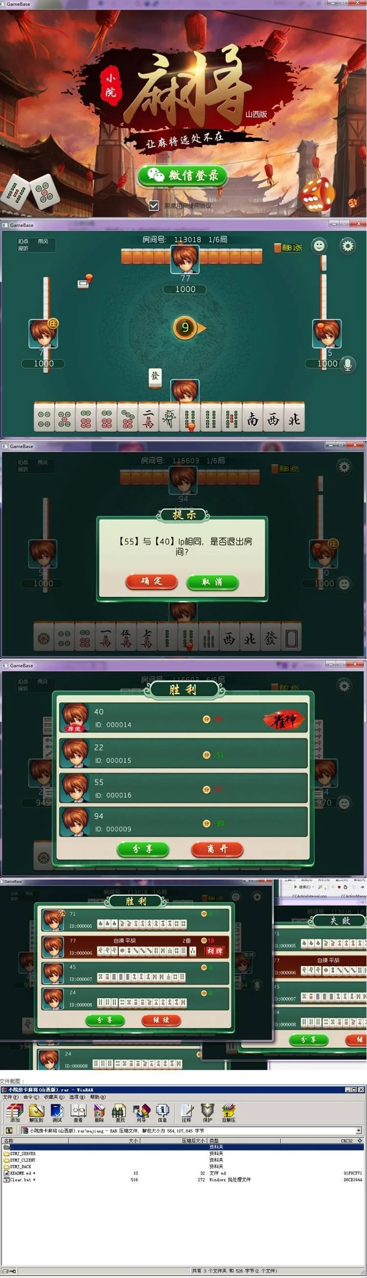 小院麻将(山西版) 手机端+服务器+网站后台完整源码 admin 编辑 商品价格 VIP免费下载 联系客服 立即下载 虚拟商品,自动发货 7 天无忧退款 源码描述:解压密码:}r;Kq@|Xkj0rll(e6c0小院麻将(山西版) 手机端+服务器+网站后台完整源码 ,手机端采用 cocos2dx 3.13.1 UI编辑器使3 6 _ | H 2用cocos studio 3.10 后台属于jav4 ! qa 开发。源码截图: