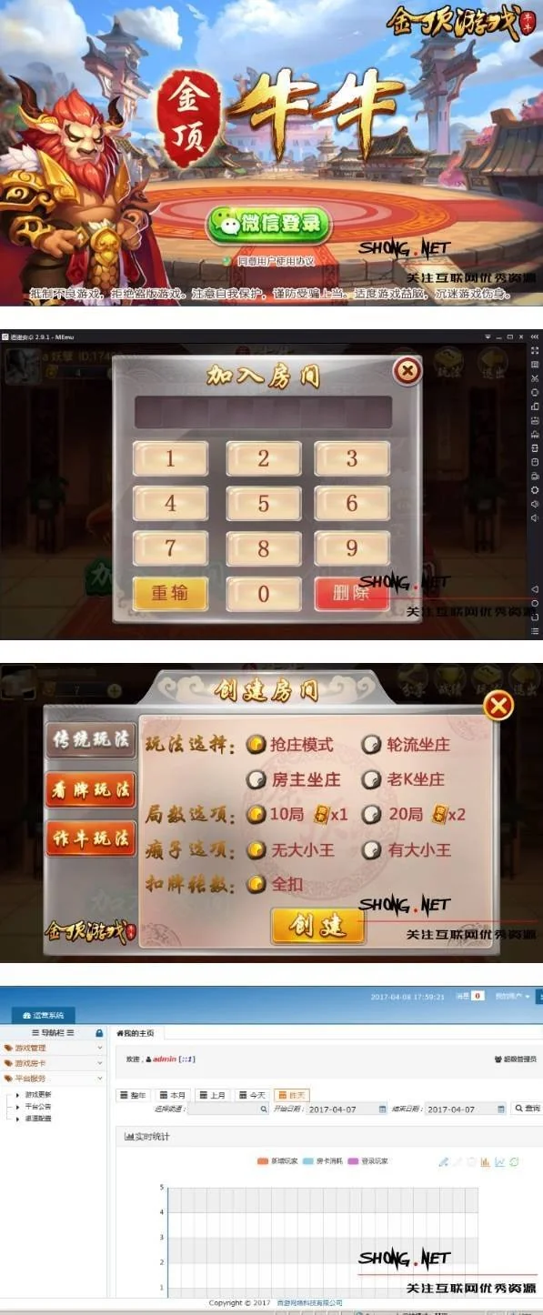 房卡五人金顶牛牛游戏源码 含服务端 客户端 数据库 cocos2dx引擎 admin 编辑 商品价格 VIP免费下载 联系客服 立即下载 虚拟商品,自动发货 7 天无忧退款 源码描述:解压密码:=2yc13<p+*nF,~eU”cm五人金顶牛牛全套程序,采用cocos2dx引擎制作,界面漂亮,游戏流畅,文件包含服务端、w L X客户端、数据库、、网站管理后台,脚本代码源码截图: