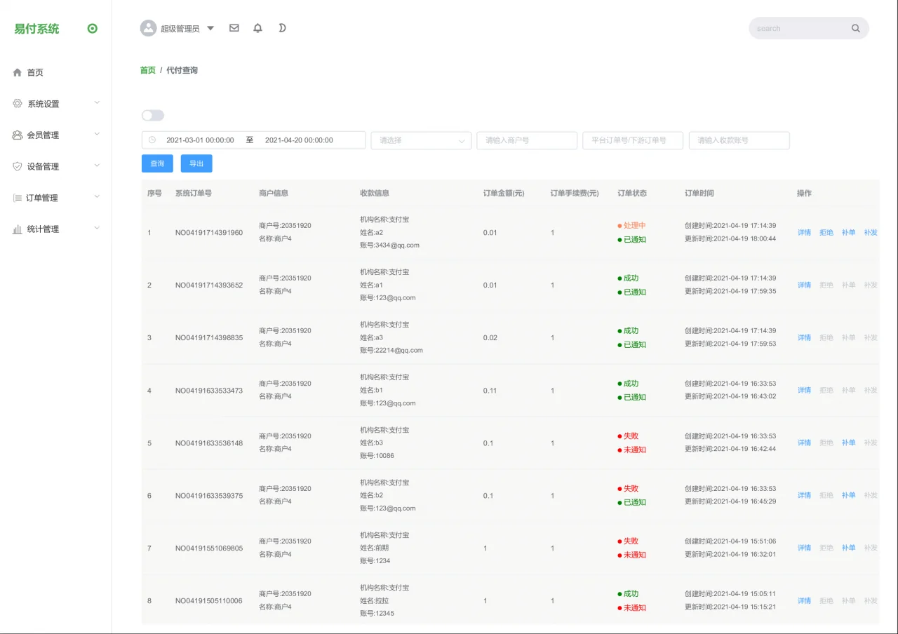 多笔代付:一次提交多个代付订d t # m U I S单信息,系统一次全自动完成。