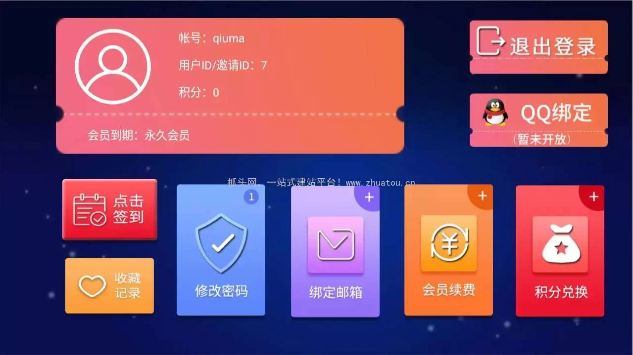 会员功能带注册邀请,绑定邮箱,邮箱找回密码,修改新密码,卡密充值,签到,积分兑换会员.