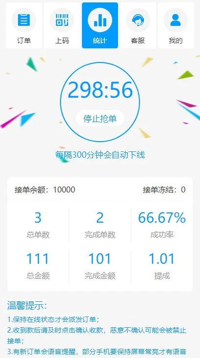 接单:会员抢单接单成功后,放单方根据金额打款到会员上传的收款账号,会员收金接单完成