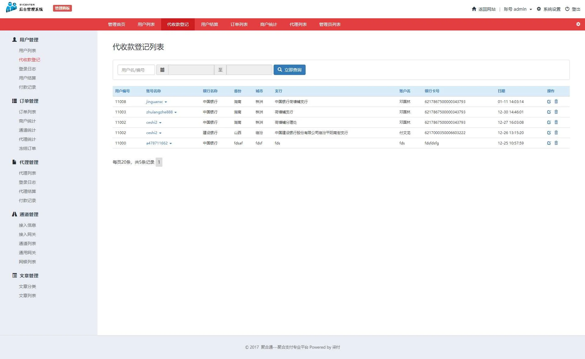 5.可查看通道列表,通用网关以及网银列表,可冻结异常订单
