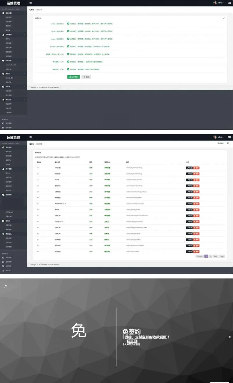运营级个人免签支付源码 带有服务监控模块强大后台功能全面 admin 编辑 商品价格 VIP免费下载 联系客服 立即下载 虚拟商品,自动发货 7 天无忧退款 运营级个人免签支付源码 带有服务监控模块强大后台功能全面1、开户,收取开户费,后端增加会员,设置费率,还可设置用户通道数量;2、服务版,提供通道,客户直接使用平台帐户,钱到平台,T+N到帐,后扣手续费;3、公开版,商户自行收款,钱直接到商户帐号,需要预存手续费;亮点功能:轮循,商户,代理商,后端多板块设置,稳固不掉单。市面上的玩法,该套系统该有的都有;