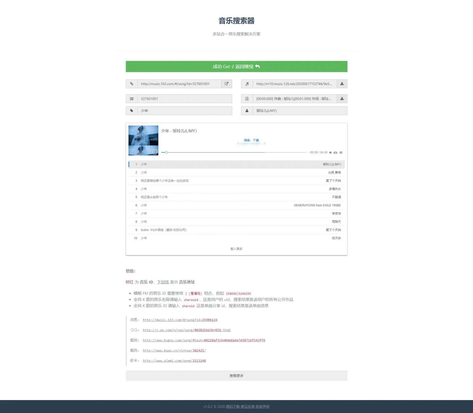 【亲测源码】聚合音乐下载系统多网合一歌曲快速下载API插口网站源码 admin 编辑 商品价格 VIP免费下载 联系客服 立即下载 虚拟商品,自动发货 7 天无忧退款 【亲测源码】聚合音乐下载系统多网合一歌曲快速下载API插口网站源码【亲测源码】聚合音乐下载系统多网合一歌曲快速下载API插口网站源码多站合一音乐搜索解决方法,数据信息启用的是各网址的API插口,有的插口并并不是对外开放的,随时随地将会无效,本新项目有关编码仅作参考。