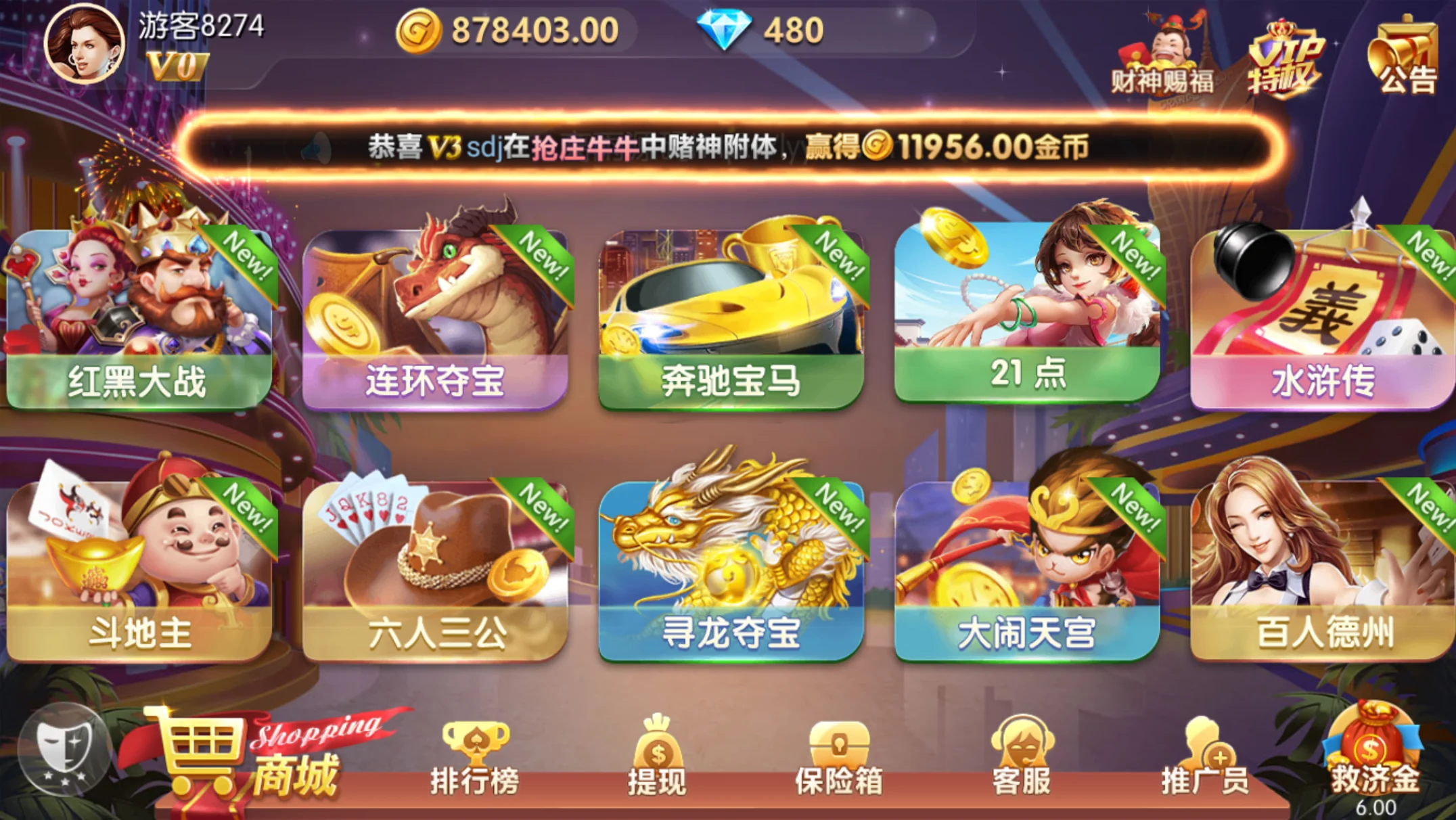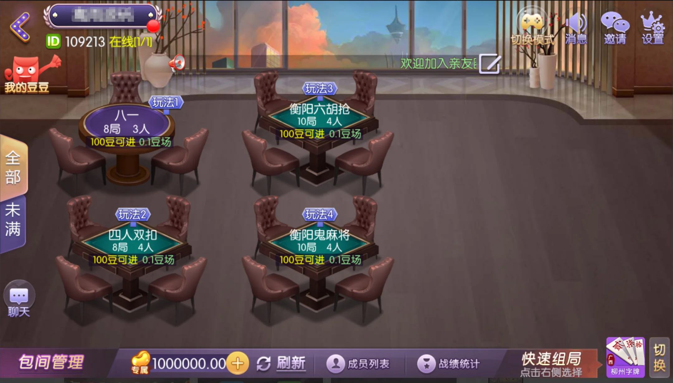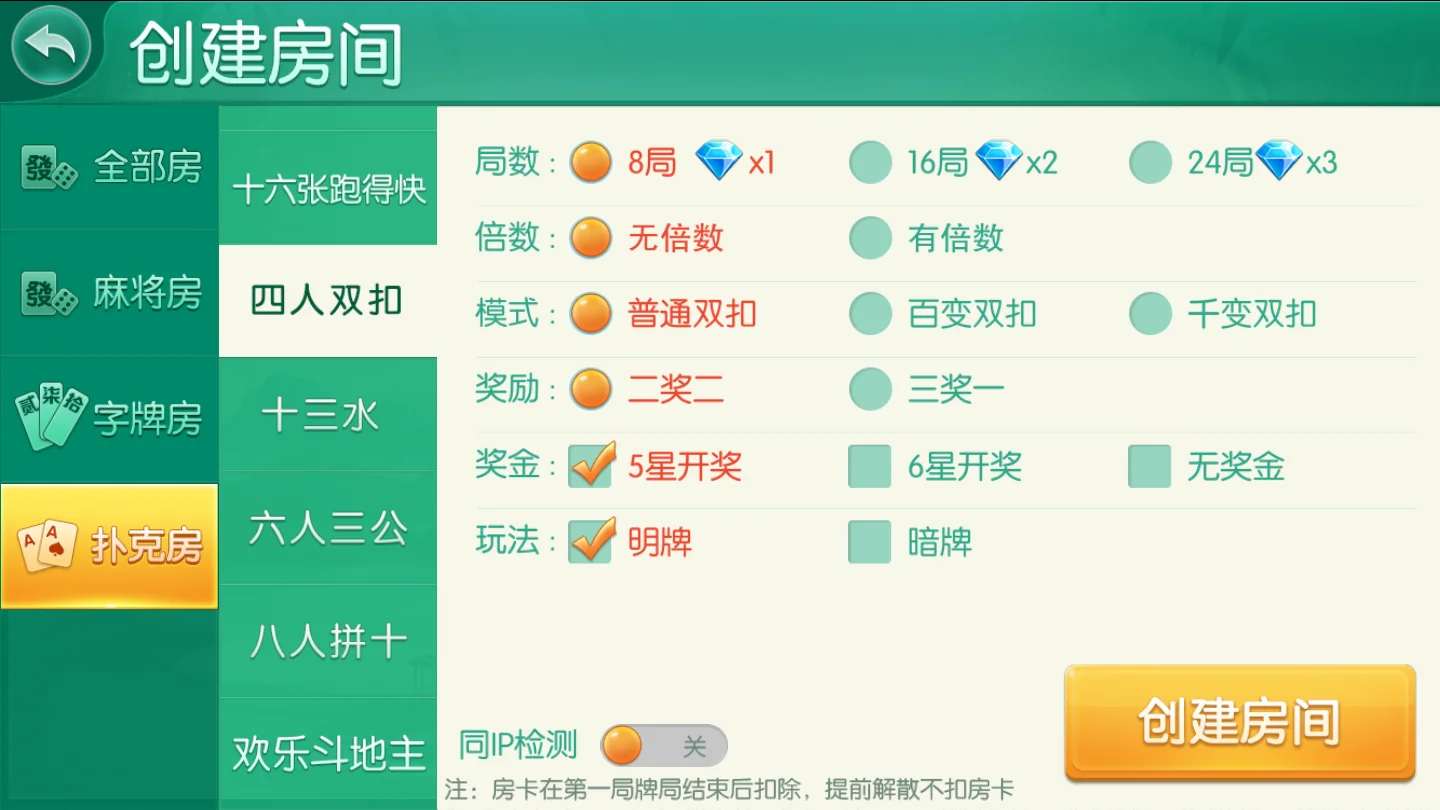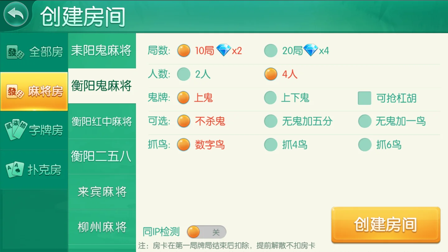 房卡版游戏:耒阳鬼麻将,哈尔滨麻将,衡阳鬼麻将,衡阳红中麻将,长沙麻将,衡阳二五八,来宾麻将,衡阳六胡抢,衡阳十胡卡,耒阳字牌,祁东十五胡,祁东六胡抢,柳州字牌,疯狂三张,德州扑克,十六张跑得快,四人双扣,十三水,广西十三水,六人三公,八人拼十,翻三皮,欢乐斗地主等游戏。