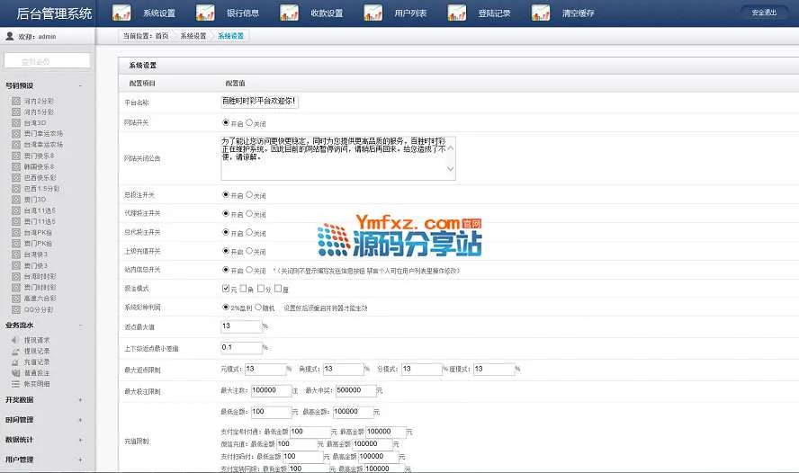 5、后台管理地址:http://admin.域名/ 用户名:admin 密码:ymfxz# % @ ) ` P , Xcom 安全码:123456