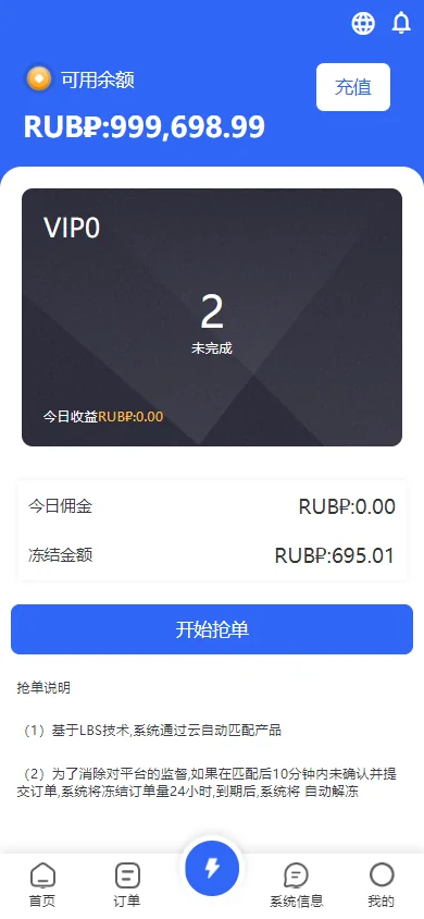 【商业收费源码】海外多语言抢单刷单系统/派单/分组杀/理财/订单自动匹配系统 admin 编辑 商品价格 ¥1899 联系客服 立即购买 已测试可商用 已查后门 包含搭建服务 售后 30 天 二开版的海外刷单系统,前端UI重构优化前端支持多语言。俄语,巴西语,墨西哥语,印尼语,越南语,土耳其语,澳大利亚语,印度语,中文,英文,波兰语,日语,西班牙语系统支持派单、分组、理财、代理后台等功能展示视频 您的浏览器不支持视频播放