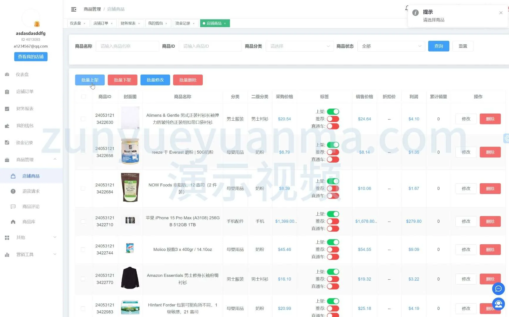 2、提供10000个商品,一键导入,无需手工创建商品;