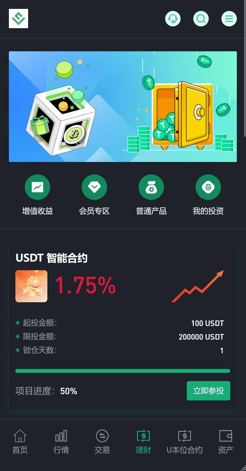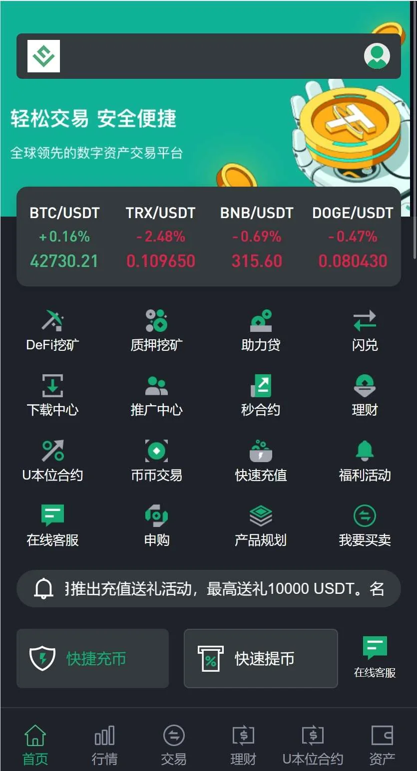 DeFi挖矿,质押挖矿,助力贷,闪兑,秒合约,期权,理财,U本位合约,币币交易,申购,黄金,贵金属,外汇交易,