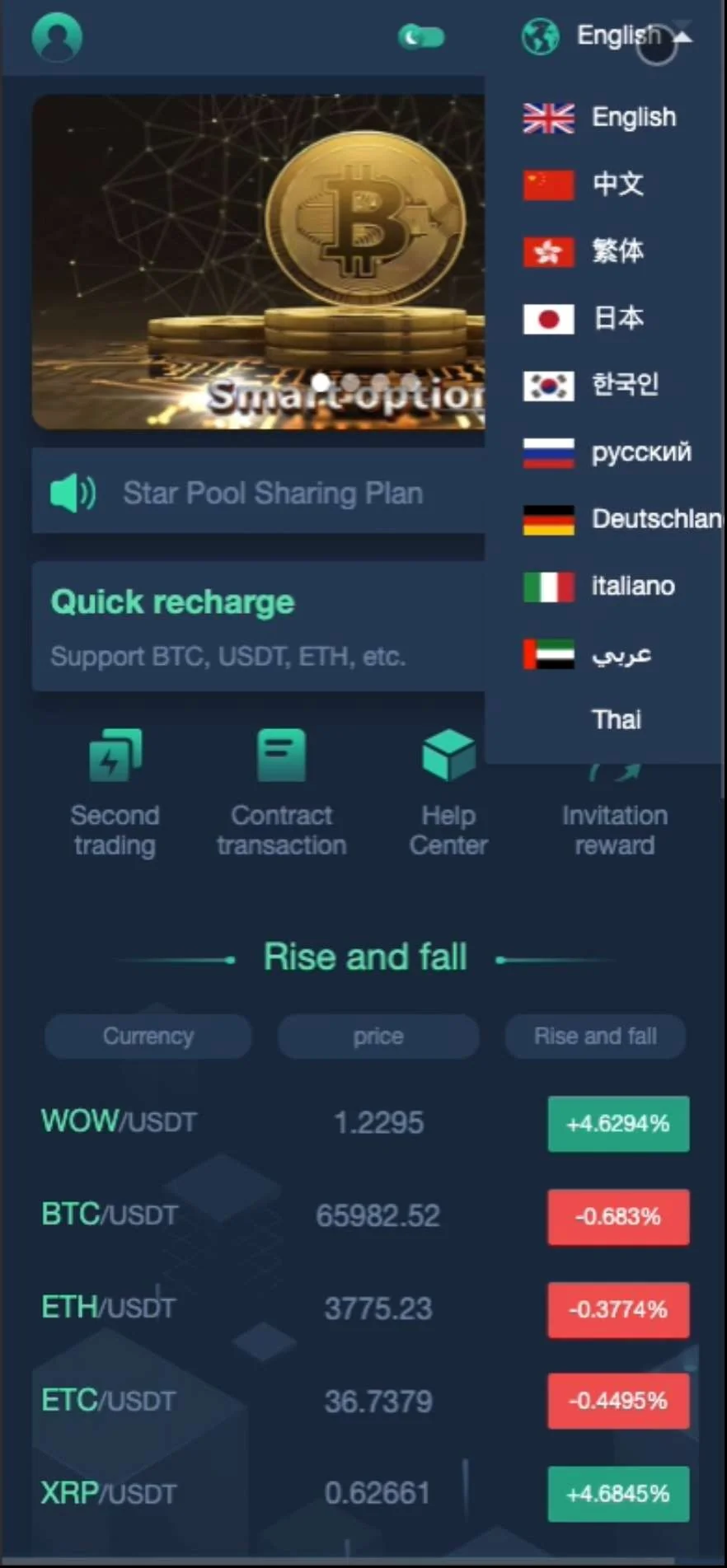 【商业收费源码】多语言海外大型交易所 admin 编辑 商品价格 ¥2800 联系客服 立即购买 已测试可商用 已查后门 包含搭建服务 售后 30 天 区块链交易所|币币交易|合约交易|期权交易|挖矿|理财|申购|秒合约? 六国语言 简体 繁体 英语 日语 韩语 俄语 前端界面白底色和深蓝底色自由切换,数字加密币交易平台,自动机器人,行情控制,USDT、BTC、ETH多币种,虚拟币交易所,代币开发,OTC下线交易源码页面展示视频 您的浏览器不支持视频播放 页面截图