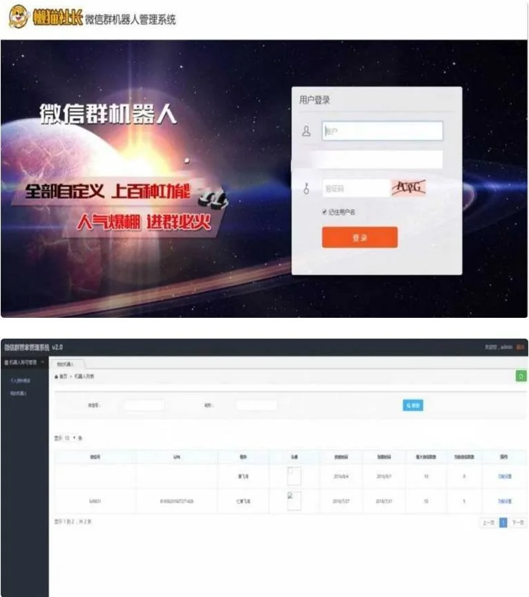 支持多微信登陆微信群机器人管理系统网站源码 admin 编辑 商品价格 VIP免费下载 联系客服 立即下载 虚拟商品,自动发货 7 天无忧退款 支持多微信登陆微信群机器人管理系统网站源码一款微信群机器人源码,支持机器人聊天等功能源码类型: C/S 开发环境: VS2010 + SQL2008R2菜单功能 1、支持同事登录多个微信 2、支持机器人聊天(笑话,成语接龙、故事会、智力等等) 3、支持签到 4、可自定义回复 5、可自定义红包语 6、支持定期发送公告(如群规,广告)等