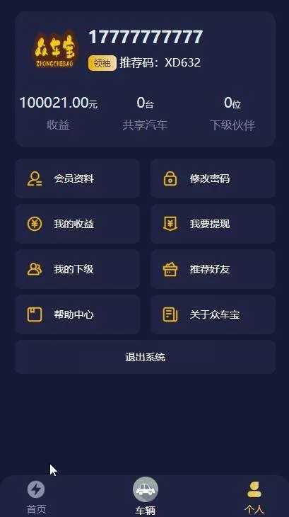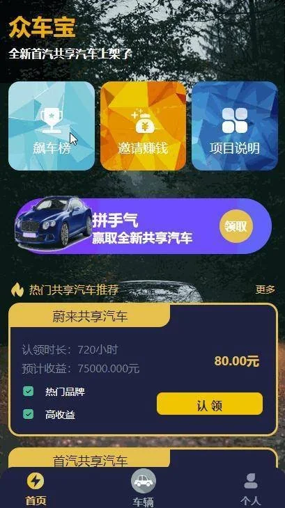 众车宝共享汽车是一款适用于市场各种场景下进行操作的共享平台,用户可以通过认领市场上的共享汽车来获取收益。此收益为共共享汽车可以上高速吗享汽车在运行过程中所获取的收益,Y Y 2 ~收益来源于用户租用共享汽车的租金分成,收入可直接在APP共享汽车押金端进行提现。