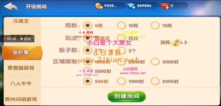 好了不多说了,东西怎么看怎么喜欢。游戏很多,牛牛,金花,斗地主,暗堡,鱼虾蟹,麻将,跑的快,红中,广东麻将都有,十三水,跑胡子也有BC源码,三公,通宝等。视频教程http://www.21tian.net/thread-70681-1-1.html