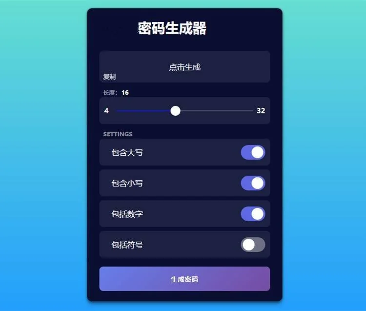 js在线随机生成密码html源码 admin 编辑 商品价格 VIP免费下载 联系客服 立即下载 虚拟商品,自动发货 7 天无忧退款 源码介绍JS随机密码生成器,密码长度4-32位,可选包含大写,包含小写,包含数字,包含符号,点击复制等功能。js的源码,该简化的简化,最高支持32位混合随机密码生成。网站截图