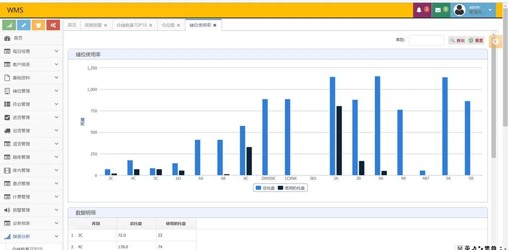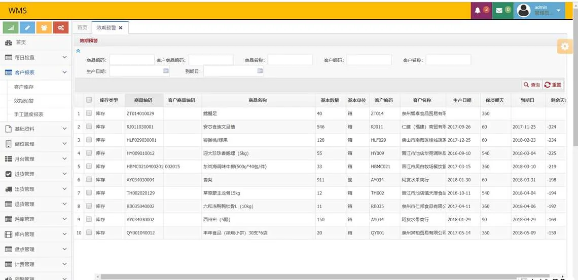 1、主要功能 计费配置、仓库配置、基础配置、计费管理、基础资料、仓库管理、月台管理、进货管理、出货管理、退货管理、库内管理、盘点管理、 库存查询、PDA功能、分析报表、分析图表、域验证。