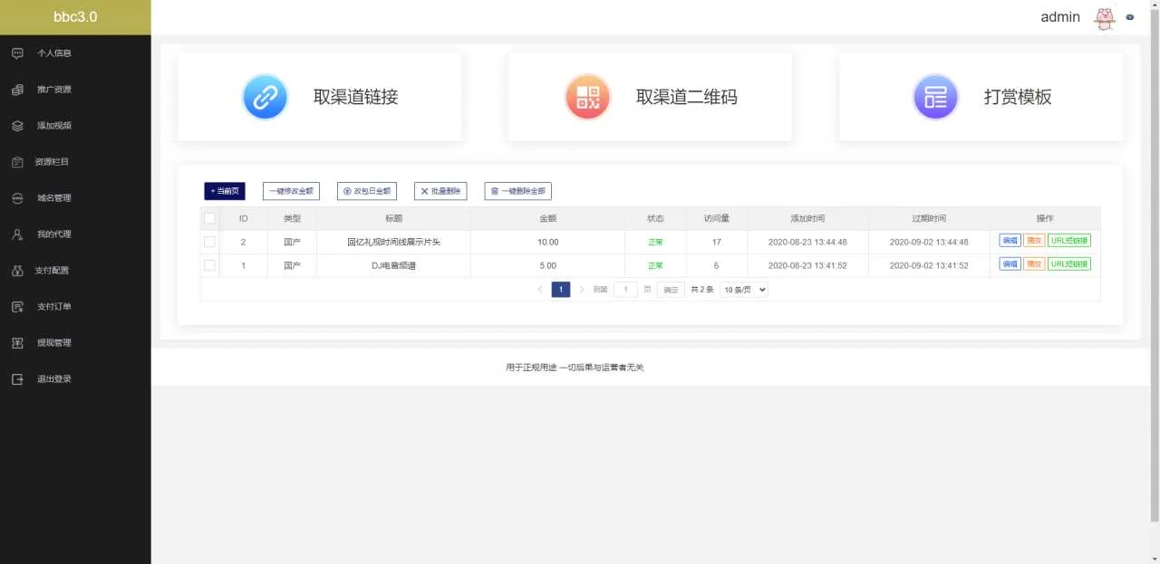 A634【付费视频打赏程序 / 包天视频付费程序】最新版视频打赏源码 / 带包天 / 可扣量 / 有代理 / 新UI / 多模板 / 非云赏V系列 admin 编辑 商品价格 VIP免费下载 联系客服 立即下载 虚拟商品,自动发货 7 天无忧退款 温馨提示:本源码提供给大家学习研究借鉴美工之用,请勿用于商业和违法用途,无任何技术支持! 用户后台界面实测截图 管理后台界面实测截图