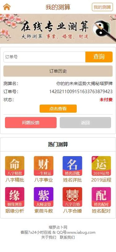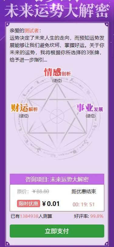 【他站亲测】2021最新塔罗牌占卜星座运势在线事业爱情塔罗测试源码/带免签约支付接口/带视频搭建教程 admin 编辑 商品价格 VIP免费下载 联系客服 立即下载 虚拟商品,自动发货 7 天无忧退款 运势测算星座塔罗牌这类源码一直都热度不减,这版非常轻量化,上传解压,填入数据库信息即可用,失效的接口也都已经一一修复,第三方免签微信支付宝双通道。数据库信息全部都已经预设完毕,无需手动分类添加星座词等等,运营成品,搭建即用。文k W c C . C ?档教程+视频教程,手把手教你搭建。 支付对接Z支付。