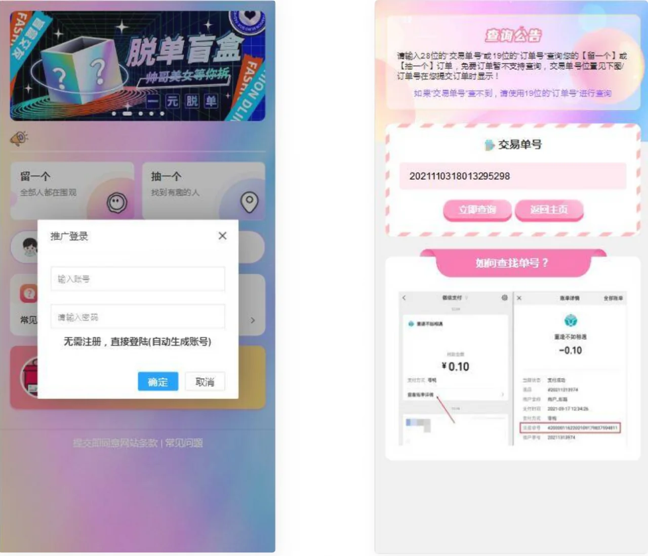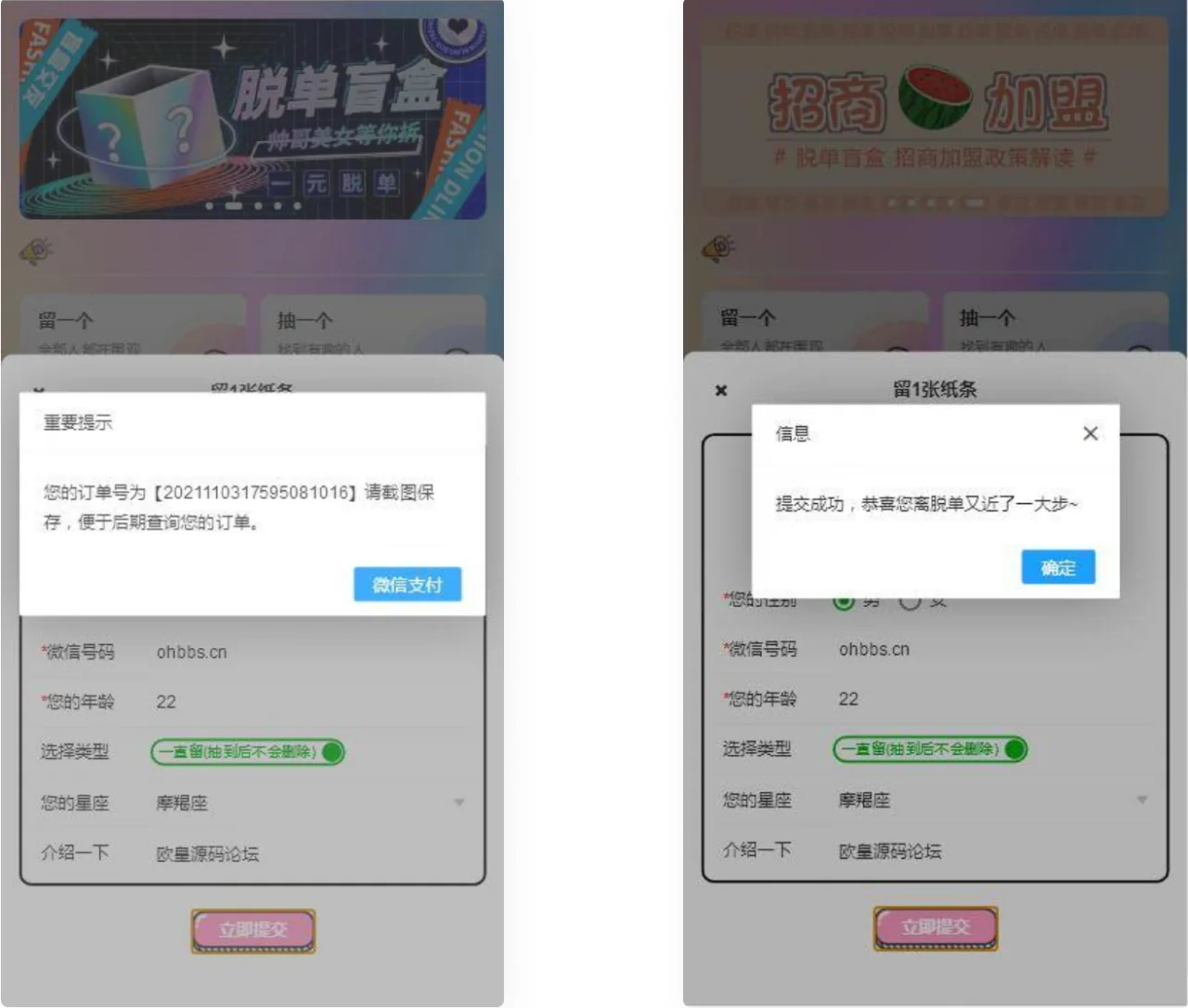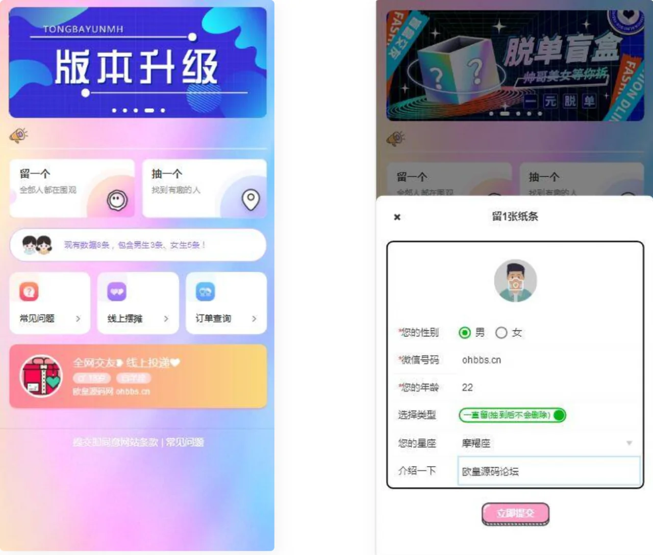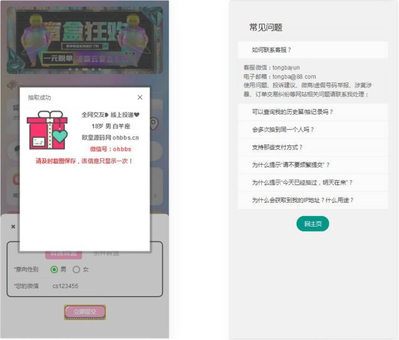 【他站亲测】2022最新H5盲盒交友系统V2.0.1版本 admin 编辑 商品价格 VIP免费下载 联系客服 立即下载 虚拟商品,自动发货 7 天无忧退款 源码介绍:搭建了下,简单的测试了下前台各个功能(存取纸条),正常使用。支付没看。 感兴趣的可以自己下载下来看下。